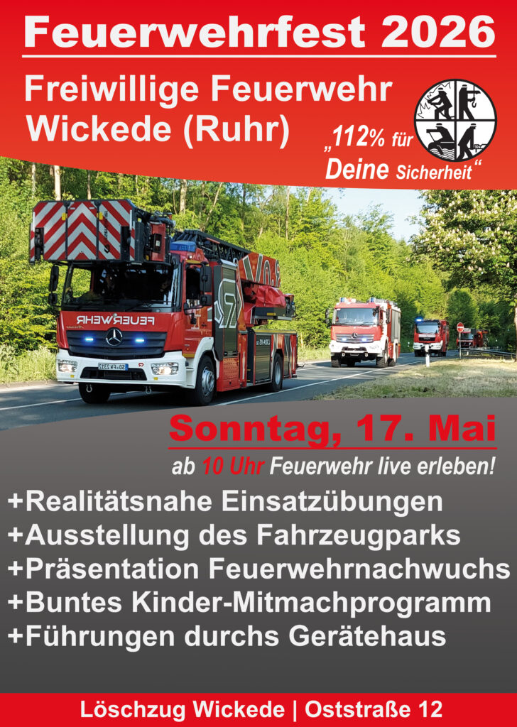 Der Löschzug 1 der Freiwilligen Feuerwehr Wickede (Ruhr) lädt am 17. Mai herzlich zum Feuerwehrfest unter dem Motto „112% Feuerwehr live erleben“ ein.