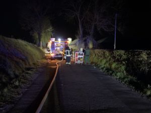 Gemeldet wurde ein PKW-Brand in direkter Hausnähe auf einem landwirtschaftlichen Anwesen. Auf der Anfahrt wurde den Kräften bereits mitgeteilt, dass mehrere Scheiben am Wohnhaus bereits durch die Hitze geplatzt waren.