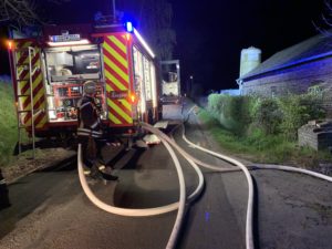 In der Phase der ersten Erkundung konnten neben dem PKW-Brand weitere Brände im Bereich der Rinder-Stallungen festgestellt werden. Letztendlich brannte es an 5 verschiedenen Stellen auf dem Gelände. Der PKW wurde von Bewohnern vor Ankunft der Feuerwehr mittels Radlader vom Haus entfernt.